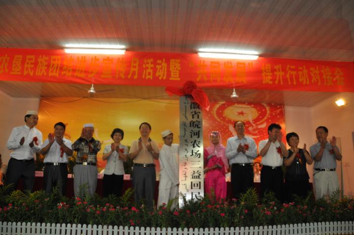 会上宣读了全省民族团结进步宣传月活动通知、省民族宗教工作领导小组关于皖河农场三益回民分场参照民族乡标准享受民族发展相关优惠政策的通知、皖河农场关于成立三益回民分场的通知。皖河农场场长胡兴兵在致词中希望三益回民分场领导班子及全体回民兄弟,要学习好、理解好民族政策,尤其是刚刚落实的民族乡优惠政策;要结合民族乡优惠政策组织开展好当前的民族团结进步宣传月活动;要放眼长远,立足当前,固本强基,发展自身;同时,要在各级民族宗教工作领导小组的指导下,按照民族乡发展的新标准、新要求,把三益回民分场打造成为全省民族聚居区中“环境优美、特色凸显、社会和谐、全面小康”的新典范。随后,省市民委和省农垦集团领导发表了热情洋溢的讲话,三益回民分场领导和回民阿訇代表发言致谢。最后,黄杰代表安庆市政府向皖河农场赠送了“民族团结画廊”,各级领导为三益回民分场成立揭牌。