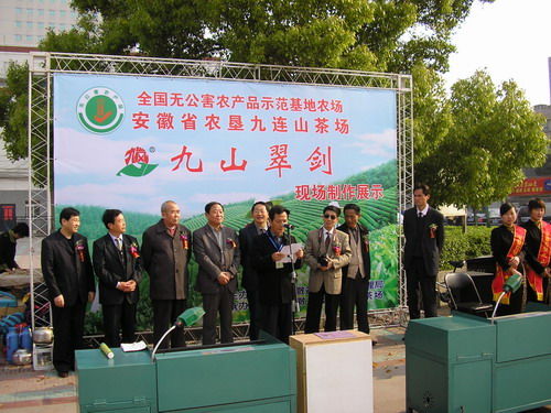 4月8日由省农垦事业管理局主办、九连山茶场承办的安徽农垦“九山翠剑”茶叶现场制作展示活动在合肥杏花公园东门广场隆重举行。这是九连山茶场围绕茶园被农业部确认为全国无公害农产品示范基地、九山翠剑茶叶荣获首届中国农业博览会金奖两大品牌,着力展示农垦茶叶产业和产品优势,提升九山翠剑品牌形象和市场竞争力,切实将资源和品牌优势转化为经济和效益优势而举办的一次品牌宣传展示活动。