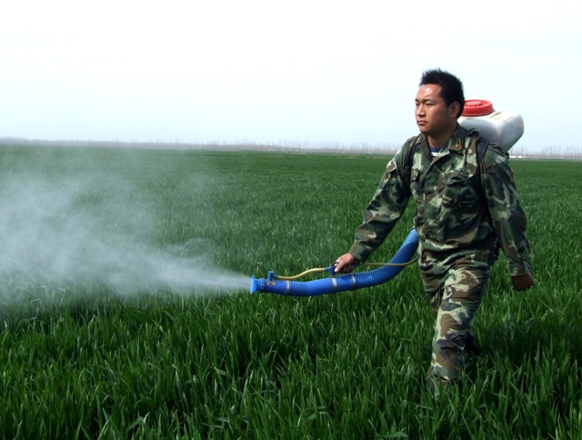 图为:食品集团(龙亢农场)一职工正在实施小麦喷药作业